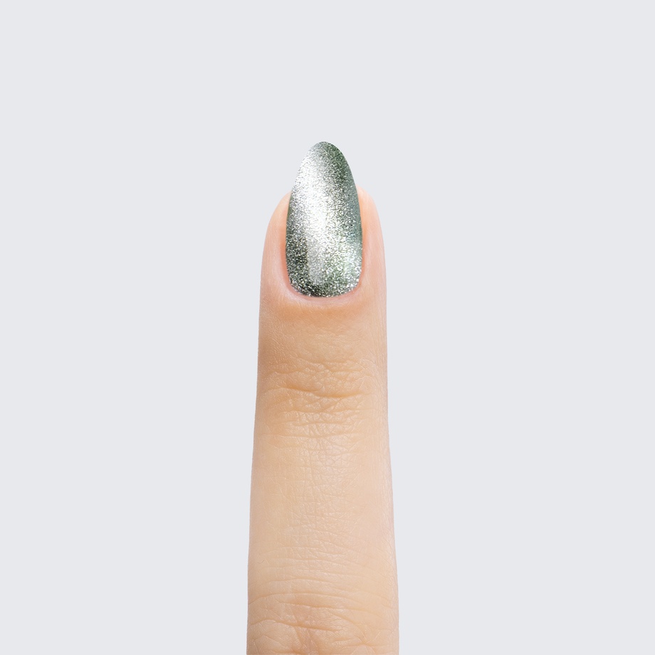 Sage green. Medium-dark. Silver magnetic shimmer. Opaque. Cool undertone.